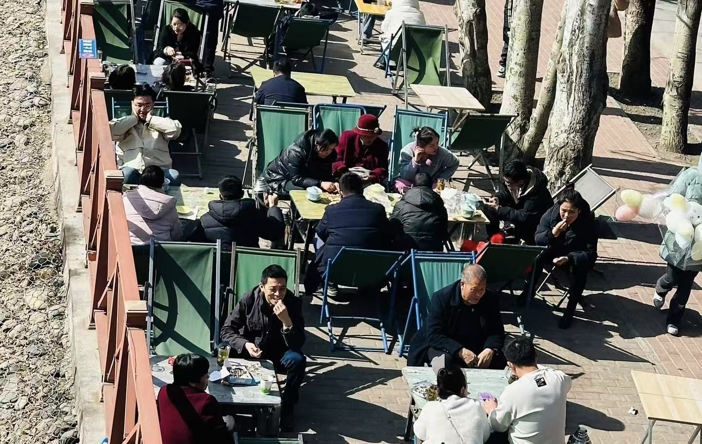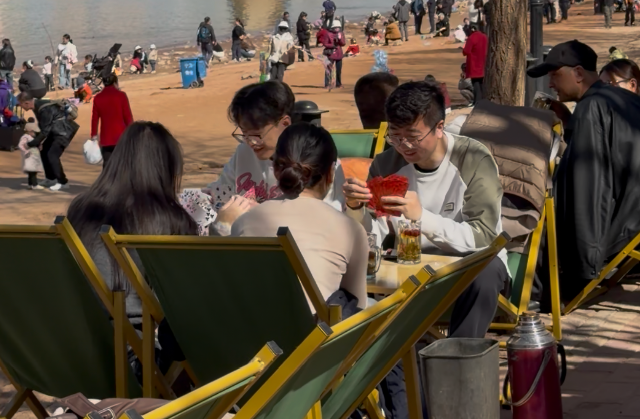 记者注意到,茶摊的消费群体涵盖了各个年龄段。既有结伴而行的退休老人,在棋牌和闲谈中消磨时光;也有年轻的父母带着孩子,在河滩边嬉戏玩耍,感受春日的亲子时光;还有不少外地游客被这种独特的休闲方式所吸引,特意前来体验这份“黄河边上的慢生活”。