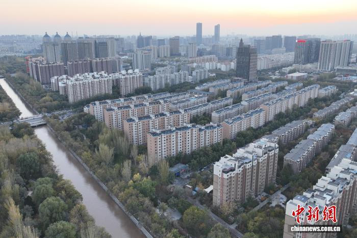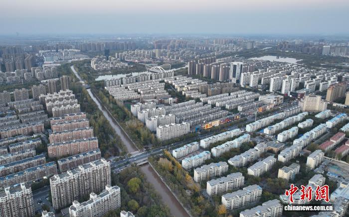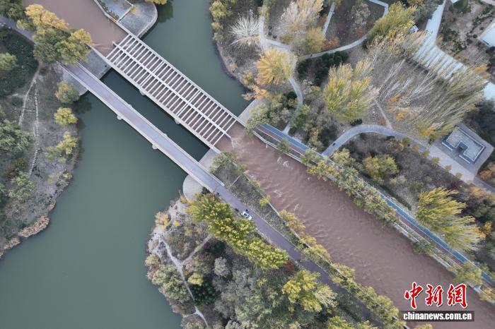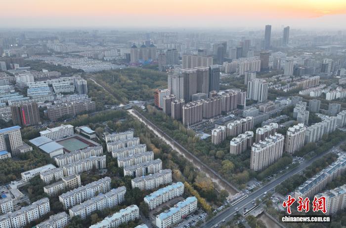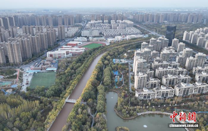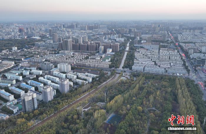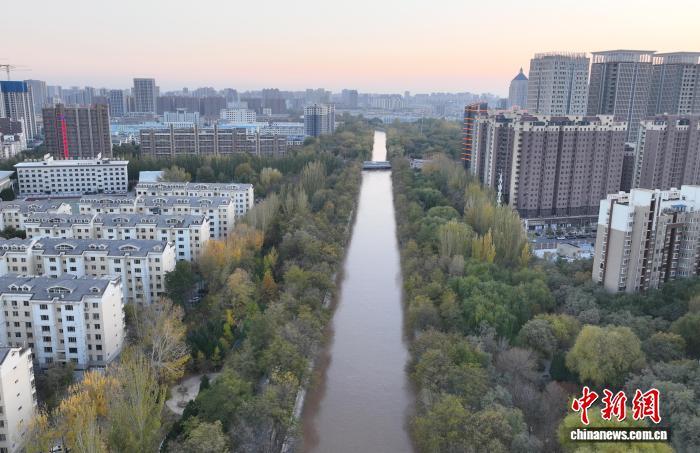 11月1日,航拍黄河水经银川唐徕渠横穿城市。近日,2025年宁夏引黄灌区冬灌拉开帷幕,冬灌计划引水10.5亿立方米,灌溉面积为500多万亩。(无人机照片)中新社记者 于晶 摄