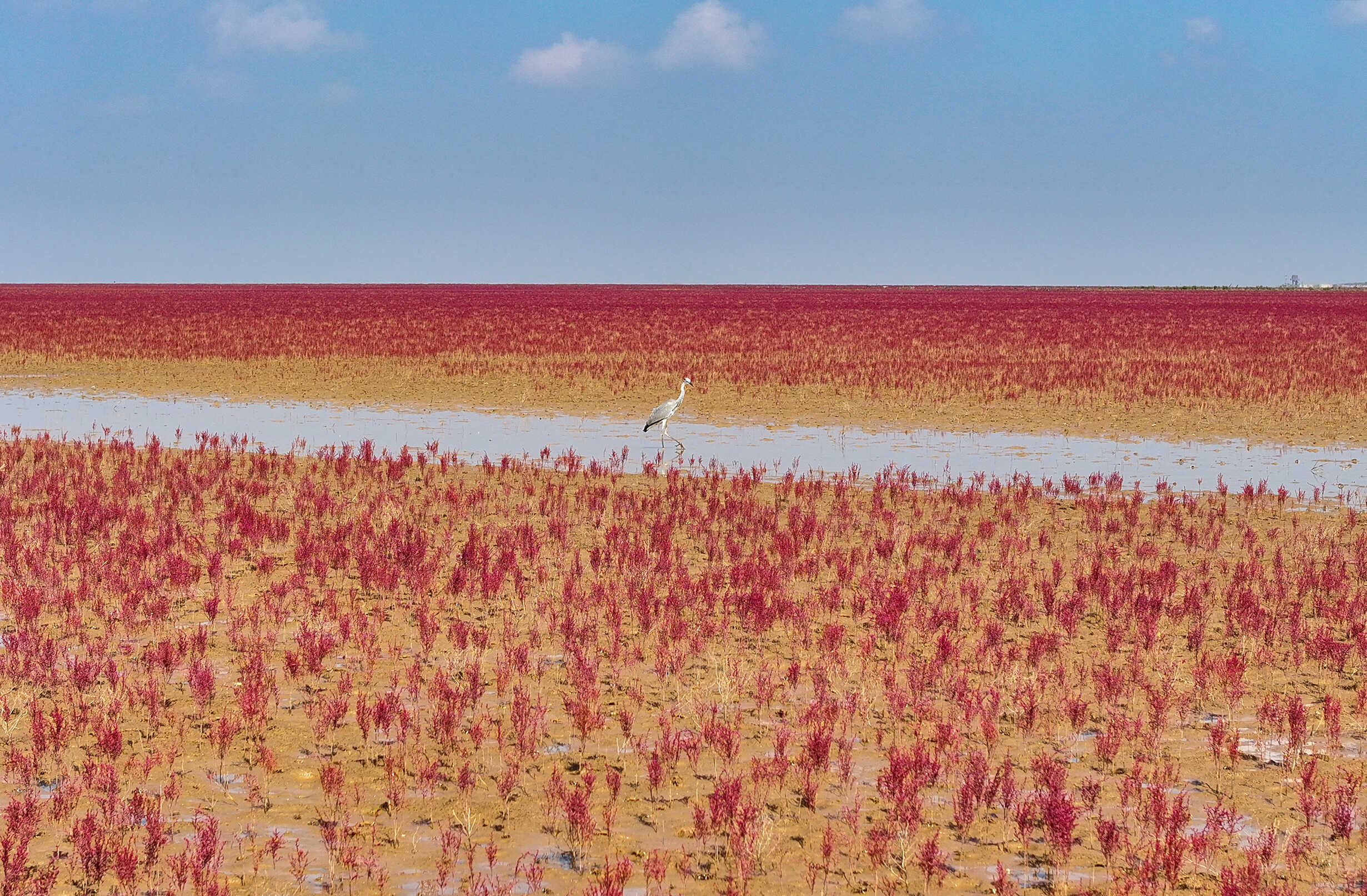 火红的盐地碱蓬在滩涂绵延,鸟儿栖息觅食。 周广学 摄