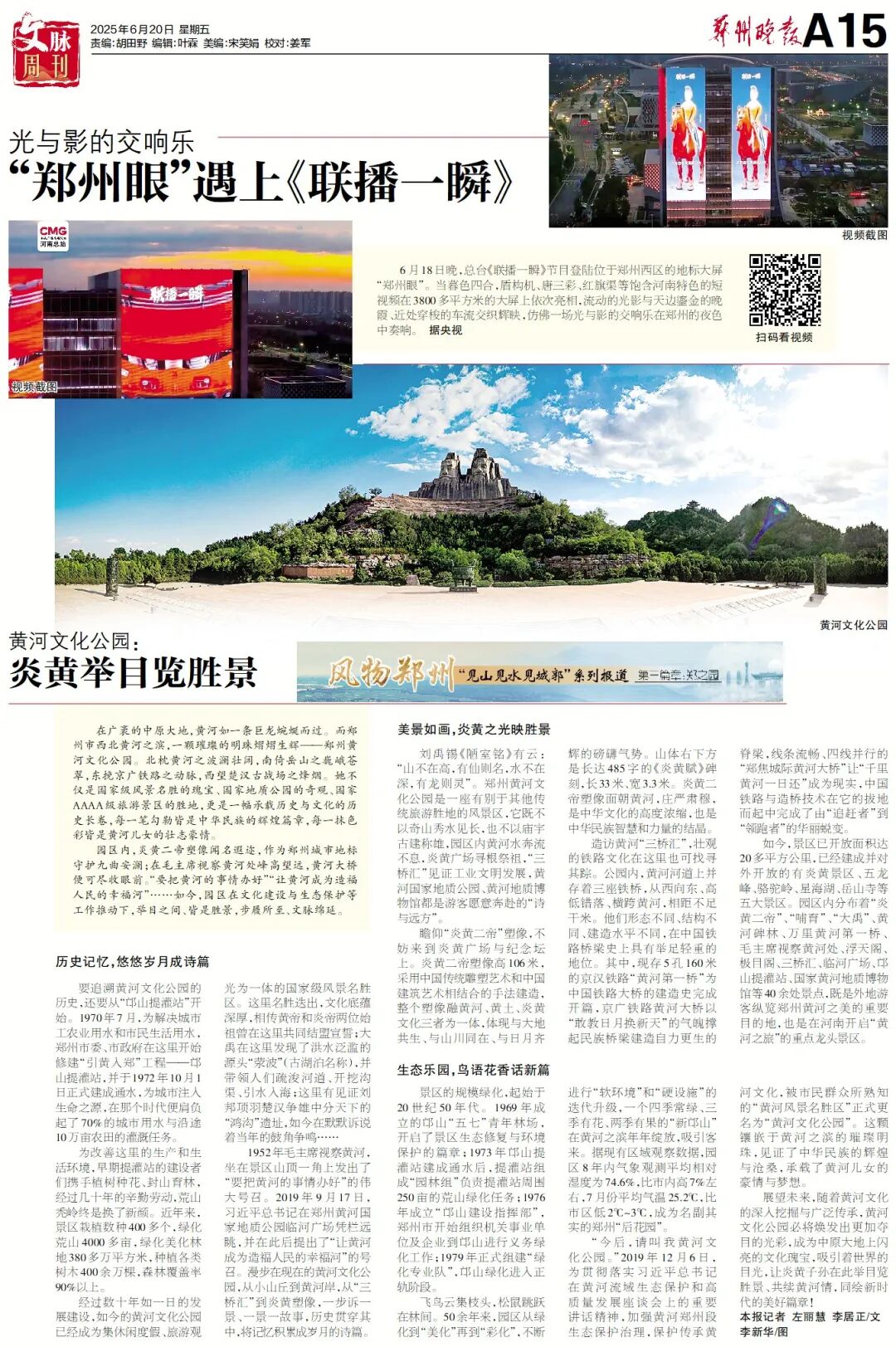 园区内,炎黄二帝塑像闻名遐迩,作为郑州城市地标守护九曲安澜;在毛主席视察黄河处峰高望远,黄河大桥便可尽收眼前。“要把黄河的事情办好”“让黄河成为造福人民的幸福河”……如今,园区在文化建设与生态保护等工作推动下,举目之间、皆是胜景,步履所至、文脉绵延。