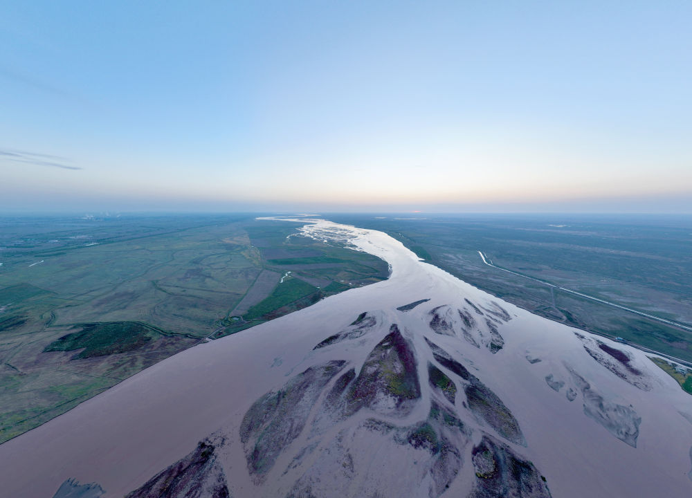 这是在山东省东营市拍摄的黄河与黄河三角洲湿地(2023年10月12日摄,无人机照片)。新华社记者 徐速绘 摄