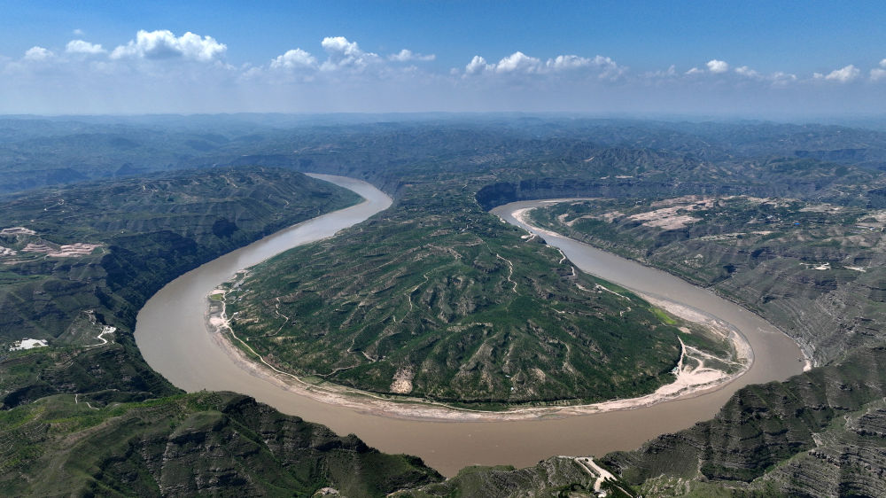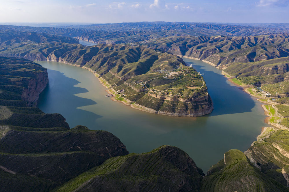 在山西省石楼县辛关镇拍摄的黄河奇湾(2023年8月3日摄,无人机照片)。新华社记者 詹彦 摄