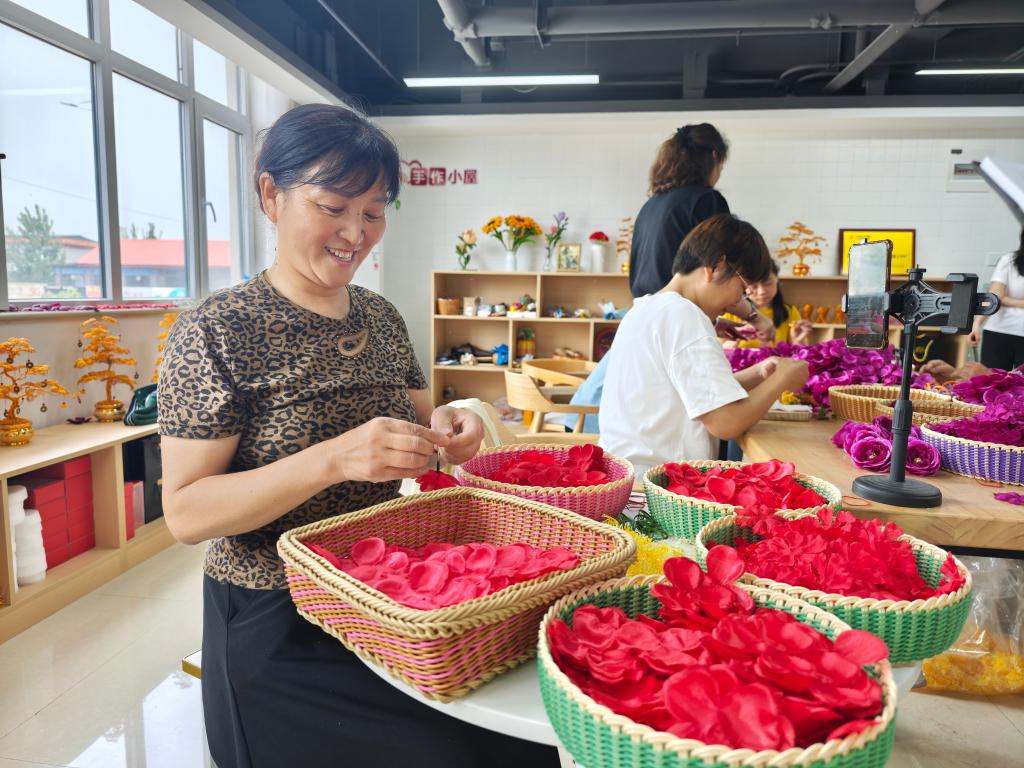 铝编发财树、手工编织包、五彩毛线花……在归德街道崇德苑社区党群服务中心的崇德工坊,各种手工制品琳琅满目,一群妇女正在赶制仿真花订单。50岁的苗化兰面前支着一部手机,屏幕前的她手法娴熟,屏幕那头的网友齐刷刷点赞。