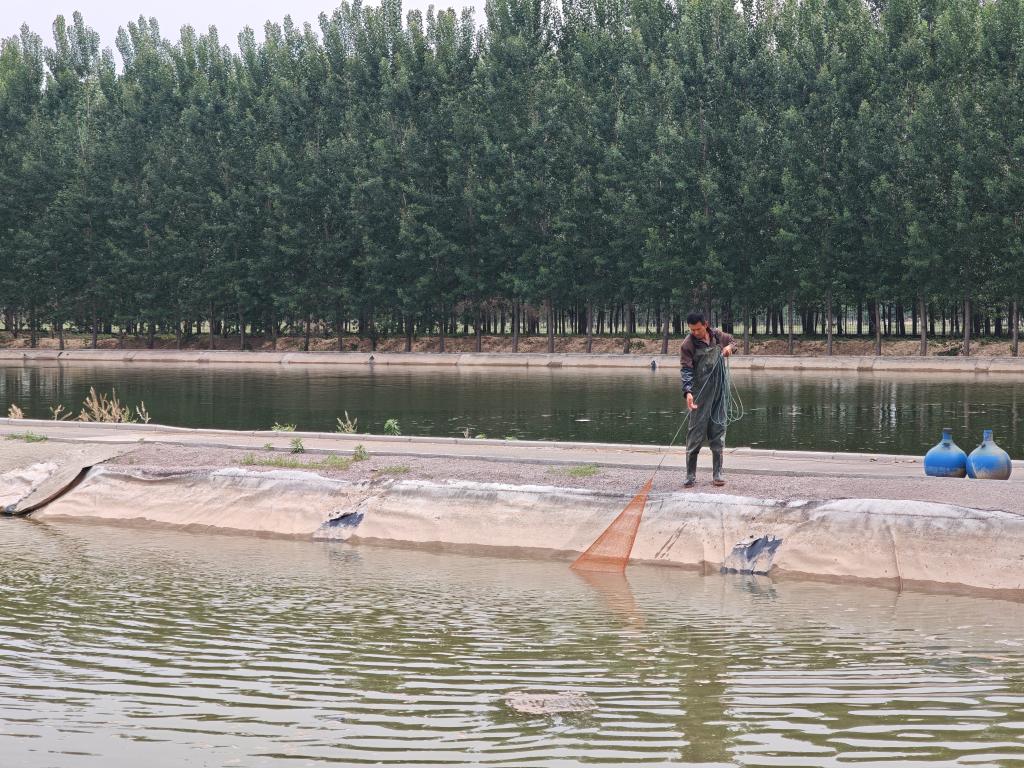 济南市长清区文昌街道新五村泉新生态农场的工作人员正在打捞黄河鲤鱼。新华社记者张昕怡 摄